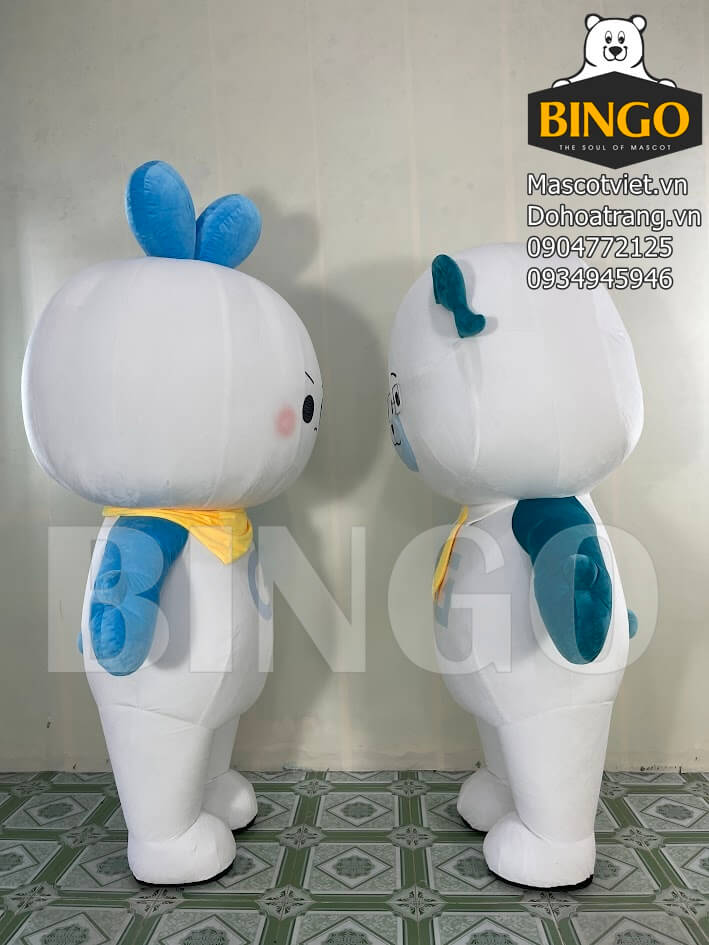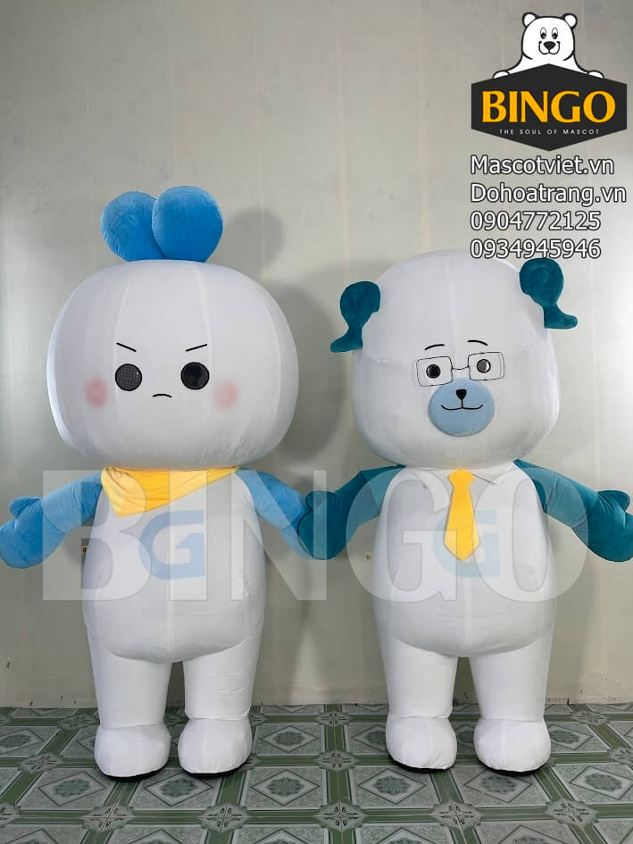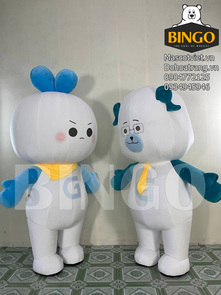 Mascot hơi Give & Kiki là cặp đôi linh vật mang phong cách hiện đại, tươi sáng và cực kỳ đáng yêu. Hai nhân vật được thiết kế đồng bộ với tông trắng chủ đạo kết hợp xanh pastel và phụ kiện vàng nổi bật, tạo nên hình ảnh trẻ trung, thân thiện và dễ nhận diện.