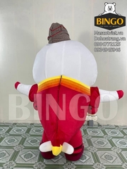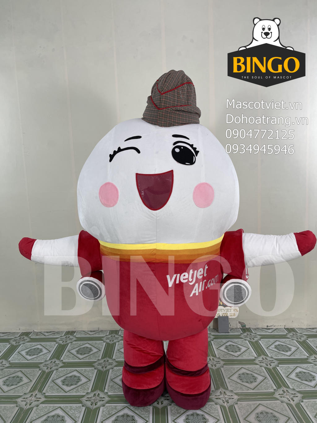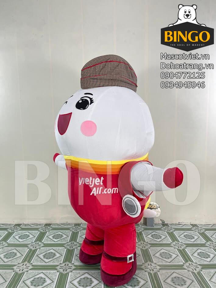 Mascot hơi máy bay Vietjet được thiết kế vui nhộn, mang hình dáng chiếc máy bay dễ thương với tông màu trắng – đỏ đặc trưng của hãng hàng không Vietjet Air. Phần đầu mascot là gương mặt tròn trắng với biểu cảm tươi cười hoặc nháy mắt, kèm má hồng tạo cảm giác thân thiện. Trên đầu đội mũ họa tiết caro nâu viền đỏ. Thân máy bay màu đỏ, in logo “vietjetAir.com” màu trắng nổi bật, có đôi cánh hai bên và động cơ mô phỏng sinh động. Đuôi máy bay màu đỏ – vàng được bo tròn an toàn. Tổng thể mang lại hình ảnh gần gũi, năng động, phù hợp cho các hoạt động quảng bá thương hiệu và sự kiện ngoài trời.