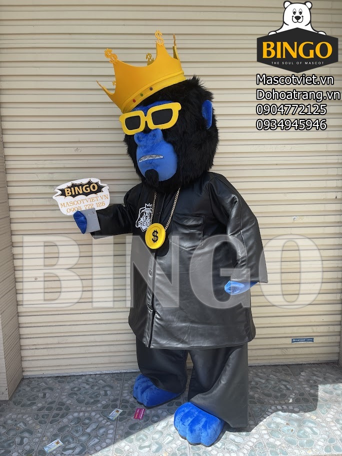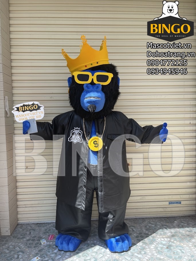 Mascot kingkong Friend club mặc trang phục đen gồm quần dài và áo sơ mi theo phong cách Hiphop. Chú đội vương miệng cùng cặp kính mắt màu vàng nổi bật trên nền phông đen. Đây là chi tiết giúp chú trông thật hài hước và nổi bật.