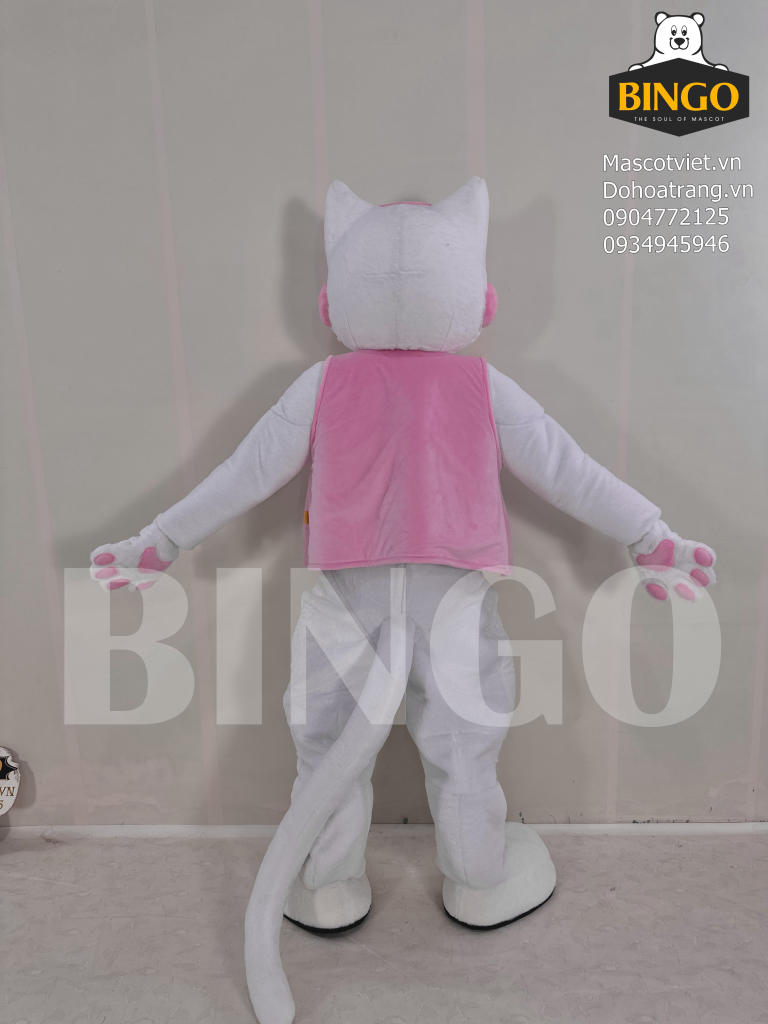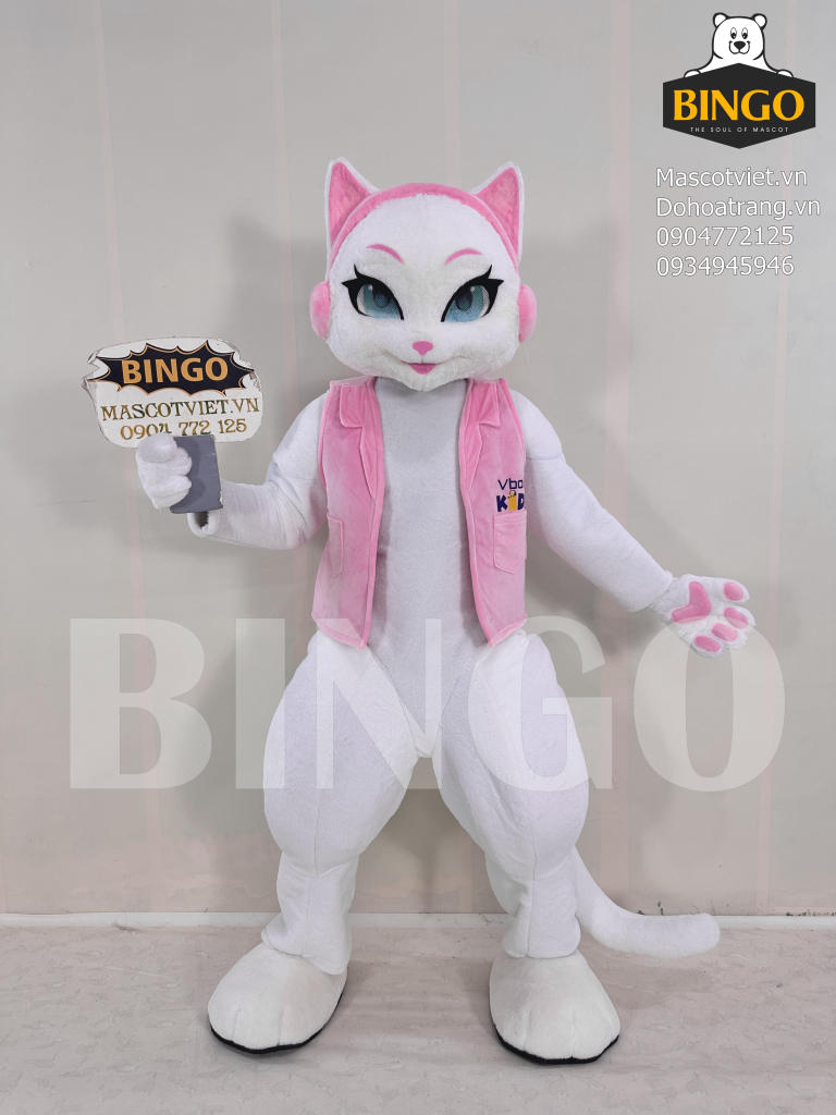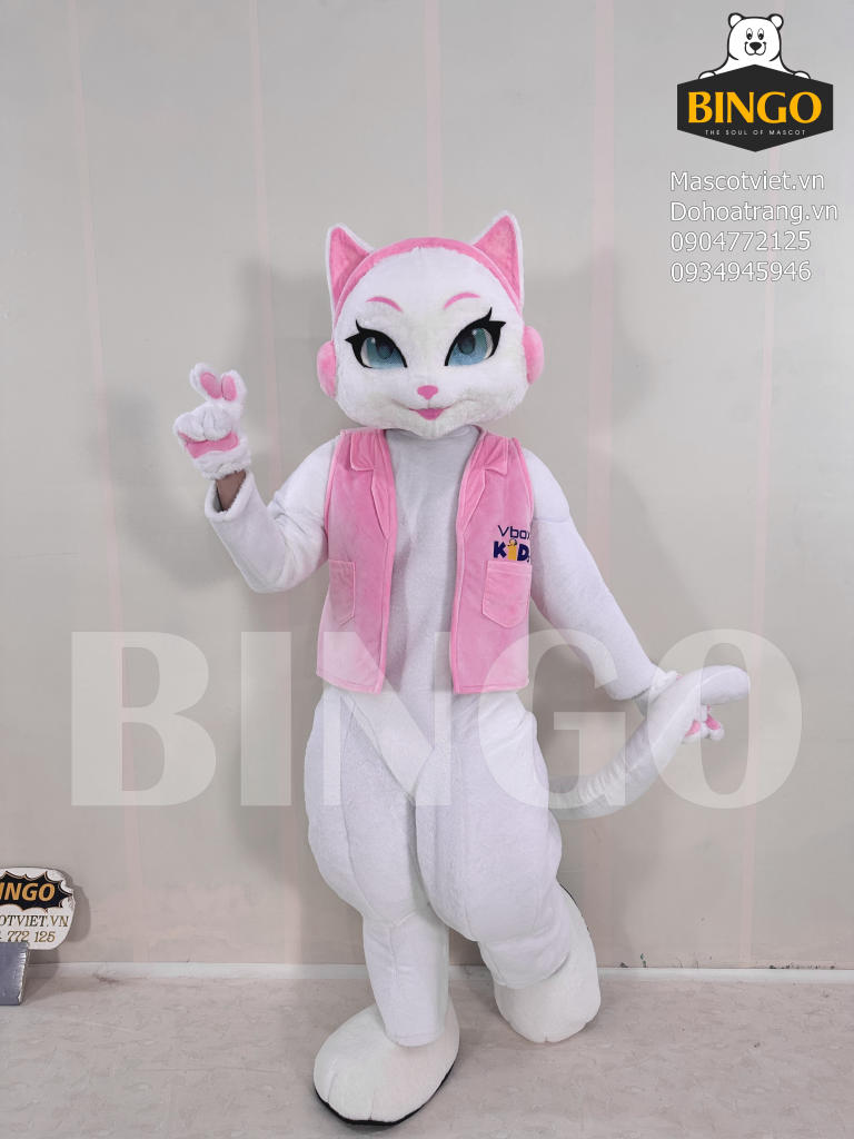 Mascot mèo VBox Kids nổi bật với thiết kế hình thể thon gọn, dáng đứng linh hoạt cùng phần đầu tạo hình mèo trắng sắc sảo với đôi mắt xanh to tròn và đường viền mắt hồng cá tính. Bộ trang phục phối màu trắng – hồng hài hòa, mang lại cảm giác dịu dàng và thu hút ánh nhìn.