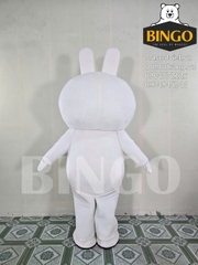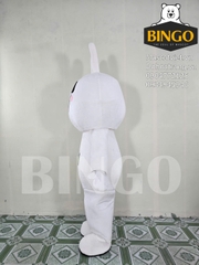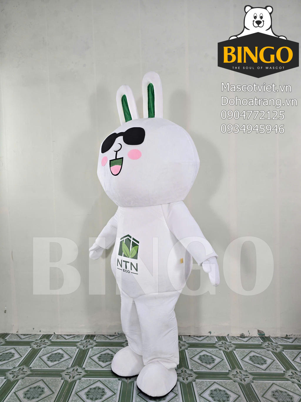 Mascot Thỏ Cony NTN là một thiết kế hóa trang lấy cảm hứng từ nhân vật hoạt hình nổi tiếng, mang lại sự dễ thương và gần gũi tuyệt đối cho thương hiệu NTN ECO. Mascot nổi bật với toàn thân màu trắng tinh khiết, hình dáng tròn trịa bầu bĩnh, cùng đôi tai dài có viền màu xanh lá cây tượng trưng cho sự tươi mới và tinh thần sinh thái. Khuôn mặt mascot được tạo hình ngộ nghĩnh với đôi má hồng và nụ cười tươi tắn, đặc biệt là cặp kính râm đen cá tính, mang lại vẻ ngoài vừa đáng yêu vừa sành điệu. Logo NTN ECO được in rõ ràng ngay trên bụng, nhấn mạnh thông điệp về sự bền vững và thân thiện với môi trường mà thương hiệu hướng tới.