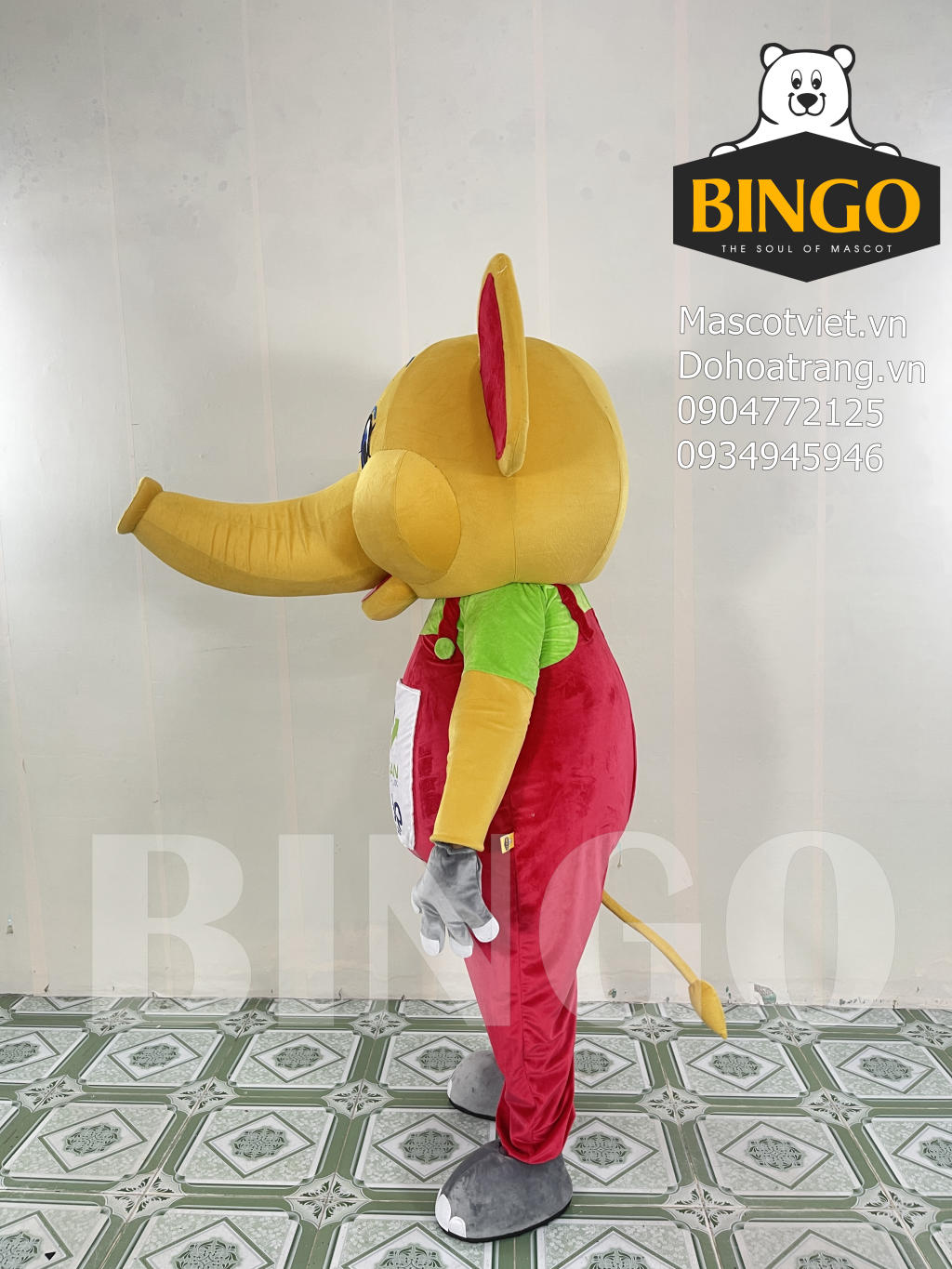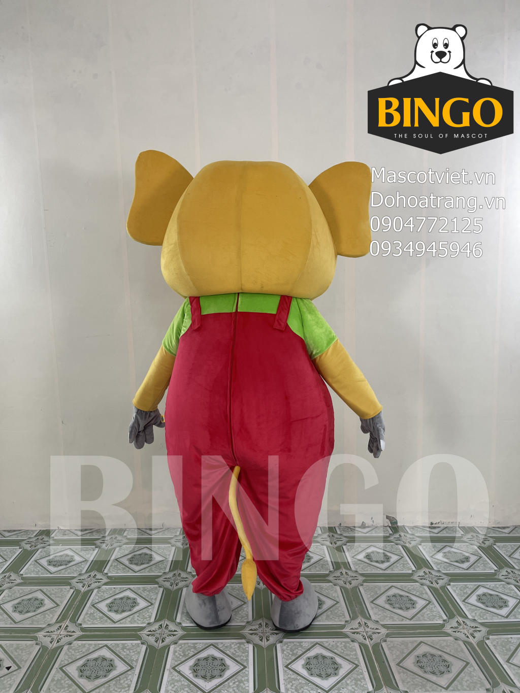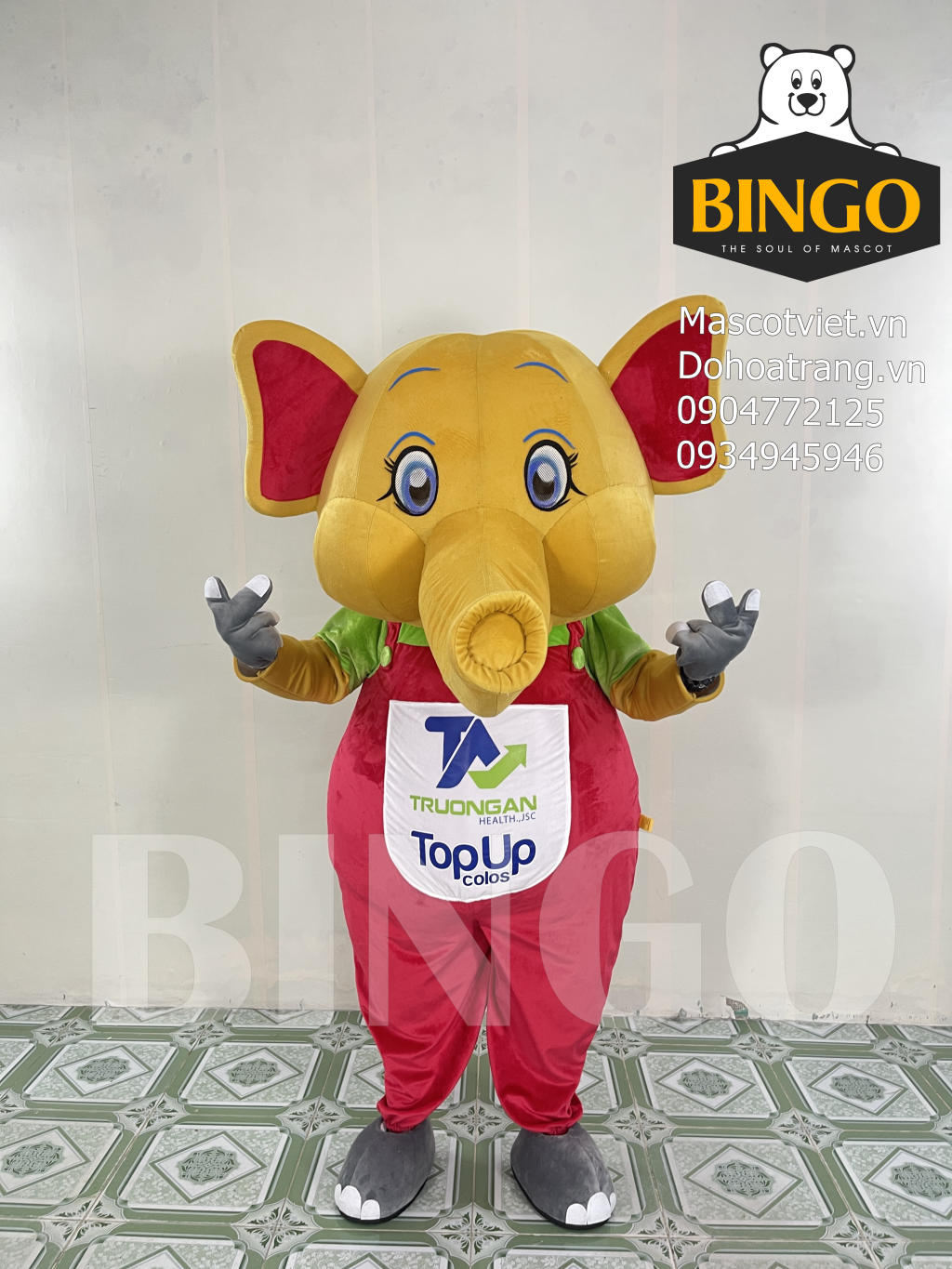 Trang phục của mascot gồm áo xanh lá tay ngắn kết hợp với quần yếm đỏ tươi, phía trước in logo “Trường An Health JSC” và “Top Up Colos” giúp nhận diện thương hiệu rõ ràng. Bàn tay và bàn chân được thiết kế dạng găng và giày bọc vải màu xám đồng bộ, kèm theo đuôi voi phía sau tạo độ chân thực.