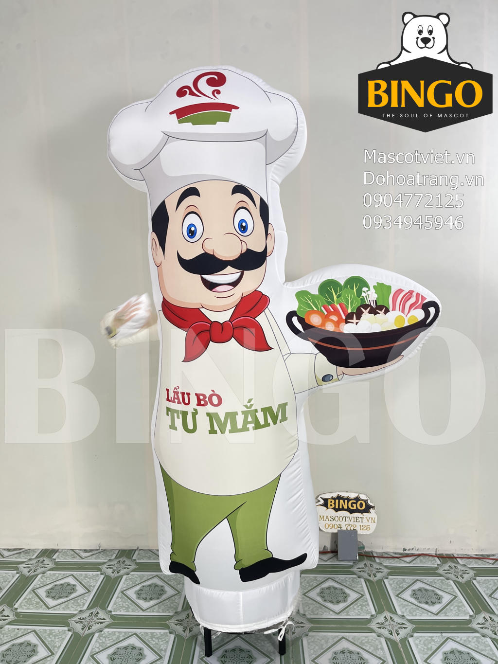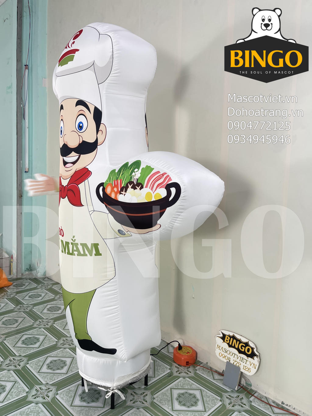 Thân rối bay được bơm hơi, đặt trên chân đế có quạt thổi liên tục để mascot luôn căng phồng và vẫy động nhẹ nhàng, thu hút sự chú ý.