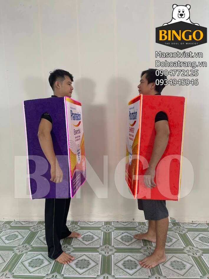 Mỗi bộ trang phục có tạo hình khối hộp chữ nhật, phần mặt trước in sắc nét toàn bộ thiết kế nhận diện của sản phẩm thật – bao gồm logo, thông tin thành phần và màu sắc thương hiệu đặc trưng: Essential với tông tím hồng sang trọng, Energy với tông cam đỏ năng động. Các cạnh viền được làm dày, giữ form hộp đứng vững, giúp tổng thể trông rõ khối và bắt mắt ở mọi góc nhìn.