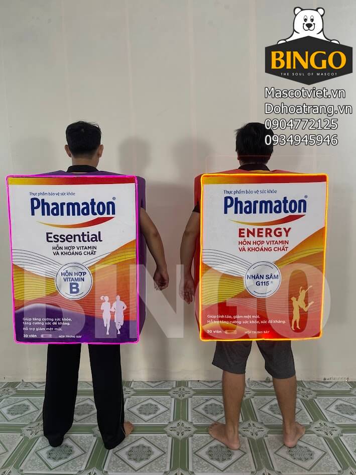 Trang phục hộp thuốc Pharmaton được thiết kế độc đáo mô phỏng theo bao bì thật của hai dòng sản phẩm Pharmaton Essential và Pharmaton Energy, mang đến hình ảnh sinh động, dễ nhận biết và cực kỳ thu hút trong các hoạt động quảng bá.